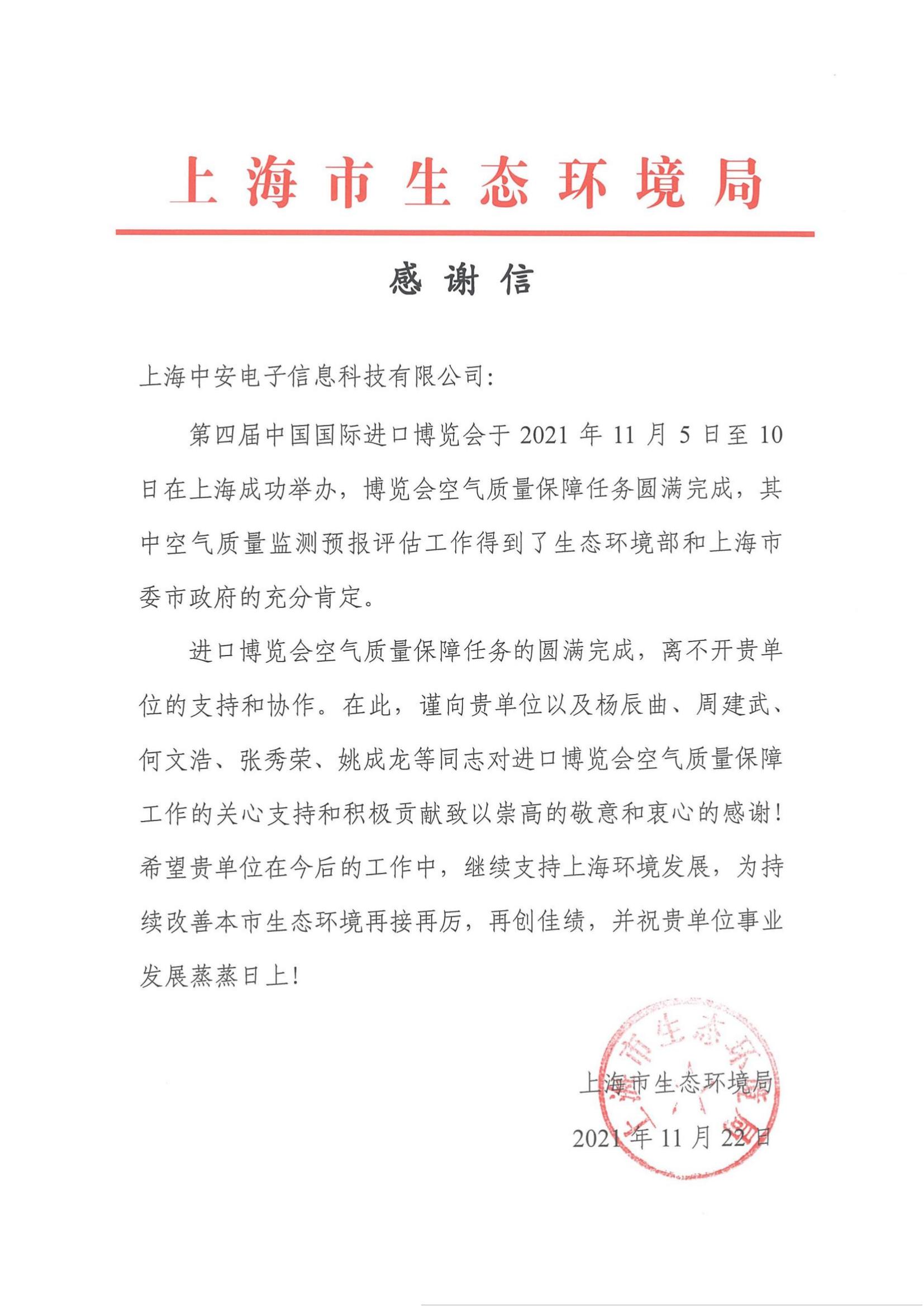 上海環(huán)監(jiān)中心就中安科技在21年國際進博會空氣質(zhì)量監(jiān)測預(yù)報工作中杰出貢獻送來感謝信!(2021/12/31)